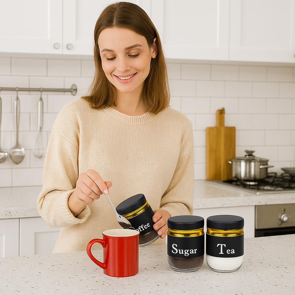 Upgrade your kitchen with this Premium 3-Piece Glass Jar Set for Coffee, Sugar & Tea, designed with airtight matte black lids, golden accents, and durable transparent glass. These containers keep your essentials fresh, odor-free, and organized, while their modern look makes them a perfect addition to any kitchen. Eco-friendly and reusable, this set is a smart choice for storage and gifting.Upgrade your kitchen with this Premium 3-Piece Glass Jar Set for Coffee, Sugar & Tea – a perfect blend of style, durability, and functionality. Made from high-quality transparent glass with airtight black lids and golden band accents, these storage containers keep your ingredients fresh, odor-free, and moisture-free for longer. Designed with eco-friendly reusable glass, they are a safe and sustainable alternative to plastic containers. The jars come with clear labeling – Coffee, Sugar, Tea – for quick access and organized storage, making your kitchen look neat and elegant. With their modern black-and-gold design, these jars complement any kitchen décor, from traditional to contemporary. Ideal for daily use at home, office, dining setup, or even as a gift, this versatile storage jar set is perfect for storing not only coffee, sugar, and tea but also spices, dry fruits, snacks, and more.
